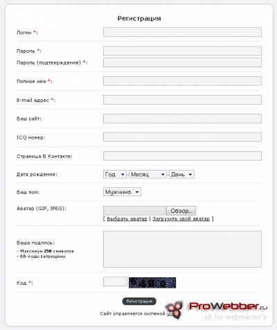 Для того, чтобы пользователю зарегистрироваться, ему необходимо ввести логин, пароль и электронный адрес. Страница регистрации пользователей показана на рисунке ниже
