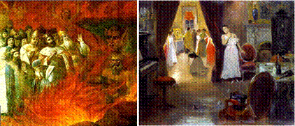 · Слева — «Л.Н. Толстой в преисподней» — фрагмент настенной росписи в храме села Тазово Курской губернии, датируемой 1883 г. Обратим внимание на тот факт, что роспись в храме сделана за 27 лет до смерти Л.Н. Толстого (1828 — 1910).