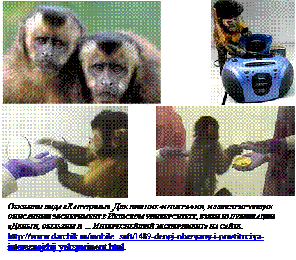 Но многие обезьяны — тоже «существа биосоциальные». Так у орангутанов выявлена культура — поведенческие навыки, передаваемая от особи к особи в процессе их общения (исследования университета Дюка, США[179]). А 6 июля 2005 г. в «New-York Times Magazine» была опубликована статья «Обезьяний бизнес»[180]. Она сообщает о результатах исследований поведения обезьян вида «Капуцины», проведённых в Йельском университете (США) «поведенческим экономистом»[181] китайского происхождения Китом Чэнем и психологом Лори Сантос.