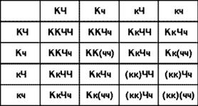 | (3А_ + 1аa) х комолые рогатые | (3В_ + 1bb) = черные красные | 9А_В_ + комолые черные | 3A_bb + комолые красные | 3ааВ_ + рогатые черные | 1 аabb рогатые красные |
