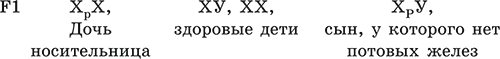 3.Пример наследования, сцепленного с полом. Известно, что у человека существует несколько признаков, сцепленных с Х-хромосомой. Одним из таких признаков является отсутствие потовых желез. Это рецессивный признак, если Х-хромосома, несущая определяющий его ген, попадает к мальчику, то у него этот признак обязательно проявится. Если вы читали известный роман Патрика Зюскинда «Парфюмер», то вы помните, что речь шла о младенце, у которого не было запаха. Рассмотрим пример наследования, сцепленного с полом. Мать имеет потовые железы, но она носительница рецессивного признака – Хр Х, отец здоров – ХУ. Гаметы матери – Хр, X. Гаметы отца – X, У.