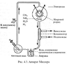 В 1953 г. американский биохимик Стенли Миллер и физик Гарольд Юри смогли экспериментально смоделировать те условия, которые существовали на Земле приблизительно 4 млрд лет назад. В специальной установке (аппарат Миллера) они подвергли смесь метана, аммиака, воды и водорода действию электрических разрядов. В результате блестящих опытов были получены аминокислоты:глицин, аланин, глутаминовая и аспаргиновая кислоты.