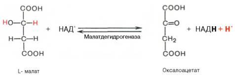 В заключительной стадии цитратного цикла малат дегидрируется с образованием оксалоа-цетата. Реакцию катализирует NAD-зависимая малатдегидрогеназа, содержащаяся в матриксе митохондрий. Равновесие малатдегидрогеназной реакции сильно сдвинуто влево. Тем не менее, в интактных клетках эта реакция идёт слева направо, потому что продукт реакции, оксалоацетат, активно используется в цитратсинтазной реакции. В цитозоле содержится изоформа малат-дегидрогеназы, также NAD-зависимая, но не принимающая участие в цитратном цикле. Обе изоформы малатдегидрогеназы - димеры.
