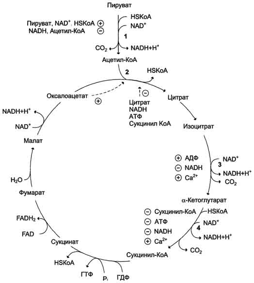 Регуляция цитратного цикла. В большинстве случаев скорость реакций в метаболических циклах определяется их начальными реакциями. В ЦТК важнейшая регуляторная реакция - образование цитрата из оксалоацетата и ацетил-КоА, катализируемая цитратсинтазой. Эта реакция ускоряется при повышении концентрации оксалоацетата - субстрата реакции и тормозится продуктом реакции - цитратом. Когда отношение NADH/NAD+ снижается, скорость окисления маната в оксалоацетат возрастает. Повышение концентрации оксалоацетата ускоряет цитратсинтазную реакцию. Скорость реакции снижается при повышении концентрации АТФ, сукцинил-КоА и длинноцепочечных жирных кислот. Однако точный механизм влияния этих метаболитов на цитратсинтазу недостаточно ясен. Изоцитратдегидрогеназа, олигомерный фермент, состоит из 8 субъединиц. Присоединение изоцитрата к первой субъединице вызывает кооперативное изменение конформации других, увеличивая скорость присоединения субстрата. Фермент аллостерически активируется АДФ и Са2+, которые присоединяются к ферменту в разных аллостерических центрах. В присутствии АДФ конформация всех субъединиц меняется таким образом, что связывание изоцитрата происходит значительно быстрее. Таким образом, при концентрации изоцитрата, которая существует в митохондриальном матриксе, небольшие изменения концентрации АДФ могут вызвать значительное изменение скорости реакции. Увеличение активности изоцитратдегидрогеназы снижает концентрацию цитрата, что, в свою очередь, уменьшает ингибирование цитратсинтазы продуктом реакции. При повышении концентрации NADH активность фермента снижается. α-Кетоглутаратдегидрогеназный комплекс, имеющий сходное строение с пируватдегидрогеназным, в отличие от последнего, не имеет в своём составе регуляторных субъединиц. Главный механизм регуляции α-кетоглутаратдегидрогеназного комплекса - ингибирование реакции NADH и сукцинил-КоА. α-Кетоглутаратдегидрогеназный комплекс, как и Изоцитратдегидрогеназа, активируется Са2+, а при повышении концентрации АТФ скорости обеих реакций снижаются. В регуляции цитратного цикла существует множество дополнительных механизмов, обеспечивающих необходимый уровень метаболитов и их участие в других метаболических путях. Компартментализация ферментов, участвующих в реакциях окислительного декарбоксилирования пирувата и цикла лимонной кислоты, играет важную роль в регуляции этих процессов. Внутренняя мембрана митохондрий непроницаема для анионов и катионов, в том числе и для промежуточных продуктов цитратного цикла, которые могут быть перенесены через мембрану только при участии специальных белков. Поэтому ферменты цитратного цикла имеют больше возможностей для взаимодействия с продуктами предыдущих реакций, чем в случае свободного удаления этих продуктов из митохондрий. Доступность субстратов возрастает также в результате образования ферментных комплексов. Малатдегидрогеназа и цитратсинтаза образуют непрочные комплексы, в которых цитратсинтаза может использовать оксалоацетат, непосредственно образующийся малатдегидрогеназой. В ПДК и α-кетоглутаратдегидрогеназном комплексе субстраты непосредственно передаются от одного фермента к другому: только транса-цилаза может взаимодействовать с промежуточным продуктом, связанным с ТДФ, а дигидро