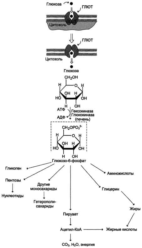 Глюкокиназа. Фосфорилирование глюкозы в гепатоцитах в период пищеварения обеспечивается свойствами глюкокиназы, которая имеет высокое значение Кm - 10 ммоль/л. В этот период концентрация глюкозы в воротной вене больше, чем в других отделах кровяного русла и может превышать 10 ммоль/л, а следовательно, активность глюкокиназы в гепатоцитах повышается. Следует отметить, что активность глюкокиназы, в отличие от гексокиназы, не ингибируется продуктом катализируемой реакции - глюкозо-6-фосфатом. Это обстоятельство обеспечивает повышение концентрации глюкозы в клетке в фосфорилированной форме, соответственно её уровню в крови. Как уже упоминалось, глюкоза проникает в гепатоциты путём облегчённой диффузии при участии транспортёра ГЛЮТ-2 (независимого от инсулина). ГЛЮТ-2, так же, как глюкокиназа, имеет высокую Кm, что способствует повышению скорости поступления глюкозы в гепатоциты в период пищеварения, следовательно, ускоряет её фосфорилирование и дальнейшее использование для депонирования. Хотя инсулин и не влияет на транспорт глюкозы, он усиливает приток глюкозы в гепатоциты в период пищеварения косвенным путём, индуцируя синтез глюкокиназы и ускоряя тем самым Фосфорилирование глюкозы. Преимущественное потребление глюкозы гепатоцитами, обусловленное свойствами глюкокиназы, предотвращает чрезмерное повышение её концентрации в крови в абсорбтивном периоде. Это, в свою очередь, снижает последствия протекания нежелательных реакций с участием глюкозы, например гликозилирования белков.