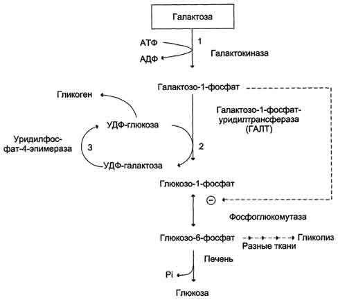 Обмен галактозы особенно интересен в связи с наследственным заболеванием - галактоземией. Галактоземия возникает при нарушении обмена галактозы, обусловленном наследственным дефектом любого из трёх ферментов, включающих галактозу в метаболизм глюкозы
