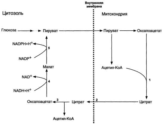 Ацетил-КоА в цитоплазме служит исходным субстратом для синтеза жирных кислот, а окса-лоацетат в цитозоле подвергается следующим превращениям Пируват транспортируется обратно в матрикс митохондрий. Восстановленный в результате действия малик-фермента NADPH используется как донор водорода для последующих реакций синтеза жирных кислот. Другой источник NADPH - окислительные стадии пентозофосфатного пути катаболизма глюкозы.
