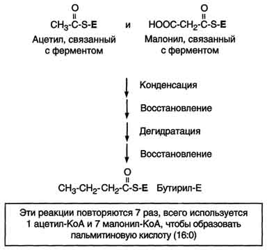 CH3-CO-SKoA + 7 HOOC-CH2-CO-SKoA + 14 (NADPH + H+) → C15H31COOH + 7 СО2 + 6 Н2О + 8 HSKoA + 14 NADP+.