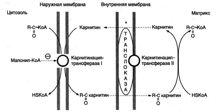Транспорт жирных кислот с длинной углеводородной цепью в митохондриях. β-Окисление жирных кислот, происходит в матриксе митохондрий, поэтому после активации жирные кислоты должны транспортироваться внутрь митохондрий. Жирные кислоты с длинной углеводородной цепью переносятся через плотную внутреннюю мембрану митохондрий с помощью карнитина. Карнитин поступает с пищей или синтезируется из незаменимых аминокислот лизина и метионина. В реакциях синтеза карнитина участвует витамин С (аскорбиновая кислота).В наружной мембране митохондрий находится фермент карнитинацилтрансфераза I (карнитин-пальмитоилтрансфераза I), катализирующий реакцию с образованием ацилкарнитина. Образовавшийся ацилкарнитин проходит через межмембранное пространство к наружной стороне внутренней мембраны и транспортируется с помощью карнитинацилкарнитинтранс-локазы на внутреннюю поверхность внутренней мембраны митохондрий, где фермент карнитинацилтрансфераза II катализирует перенос ацила на внутримитохондриальный КоА. Таким образом, ацил-КоА становится доступным для ферментов β-окисления. Свободный карнитин возвращается на цитозольную сторону внутренней мембраны митохондрий той же транслоказой. На внутренней поверхности внутренней мембраны находится фермент карнитинацил трансфераза II, катализирующий обратный перенос ацила с карнитина на внутримитохондриальный КоА. После этого ацил-КоА включается в реакции β-окисления.