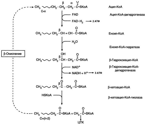 β-Окисление начинается с дегидрирования ацил-КоА FAD-зависимой ацил-КоА дегидрогеназой с образованием двойной связи между α- и β-атомами углерода в продукте реакции - еноил-КоА. Восстановленный в этой реакции кофермент FADH2 передаёт атомы водорода в ЦПЭ на кофермент Q. В результате синтезируются 2 молекулы АТФ. В следующей реакции р-окисления по месту двойной связи присоединяется молекула воды таким образом, что ОН-группа находится у β-углеродного атома ацила, образуя β-гидроксиацил-КоА. Затем β-гидроксиацил-КоА окисляется NАD+-зависимой дегидрогеназой. Восстановленный NADH, окисляясь в ЦПЭ, обеспечивает энергией синтез 3 молекул АТФ. Образовавшийся β-кетоацил-КоА подвергается тиолитическому расщеплению ферментом тиолазой, так как по месту разрыва связи С-С через атом серы присоединяется молекула кофермента А. В результате этой последовательности из 4 реакций от ацил-КоА отделяется двухуглеродный остаток - ацетил-КоА. Жирная кислота, укороченная на 2 атома углерода, опять проходит реакции дегидрирования, гидратации, дегидрирования, отщепления ацетил-КоА. Эту последовательность реакций обычно называют "циклом β-окисления", имея в виду, что одни и те же реакции повторяются с радикалом жирной кислоты до тех пор, пока вся кислота не превратится в ацетильные остатки.