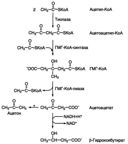 Синтез кетоновых тел начинается с взаимодействия двух молекул ацетил-КоА, которые под действием фермента тиолазы образуют ацетоацетил-КоА. С ацетоацетил-КоА взаимодействует третья молекула ацетил-КоА, образуя 3-гидрокси-3-метилглутарил-КоА (ГМГ-КоА). Эту реакцию катализирует фермент ГМГ-КоА-синтаза. Далее ГМГ-КоА-лиаза катализирует расщепление ГМГ-КоА на свободный ацетоацетат и ацетил-КоА. Ацетоацетат может выделяться в кровь или превращаться в печени в другое кетоновое тело - β-гидроксибутират путём восстановления. В клетках печени при активном β-окислении создаётся высокая концентрация NADH. Это способствует превращению большей части ацетоацетата в β-гидроксибутират, поэтому основное кетоновое тело в крови - именно β-гидроксибутират. При голодании для многих тканей жирные кислоты и кетоновые тела становятся основными топливными молекулами. Глюкоза используется в первую очередь нервной тканью и эритроцитами. При высокой концентрации ацетоацетата часть его неферментативно декарбоксилируется, превращаясь в ацетон. Ацетон не утилизируется тканями, но выделяется с выдыхаемым воздухом и мочой. Таким путём организм удаляет избыточное количество кетоновых тел, которые не успевают окисляться, но, являясь водорастворимыми кислотами, вызывают ацидоз. При длительном голодании кетоновые тела становятся основным источником энергии для скелетных мышц, сердца и почек. Таким образом глюкоза сохраняется для окисления в мозге и эритроцитах. Уже через 2-3 дня после начала голодания концентрация кетоновых тел в крови достаточна для того, чтобы они проходили в клетки мозга и окислялись, снижая его потребности в глюкозе. β-Гидроксибутират, попадая в клетки, дегидрируется NAD-зависимой дегидрогеназой и превращается в ацетоацетат. Ацетоацетат активируется, взаимодействуя с сук-цинил-КоА - донором КоА: