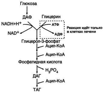 В жировой ткани для синтеза жиров используются в основном жирные кислоты, освободившиеся при гидролизе жиров ХМ и ЛПОНП. Жирные кислоты поступают в адипоциты, превращаются в производные КоА и взаимодействуют с глицерол-3-фосфатом, образуя сначала лизофосфатидную кислоту, а затем фосфатидную. Фосфатидная кислота после дефосфорилирования превращается в диацилглицерол, который ацилируется с образованием триацилглицерола.