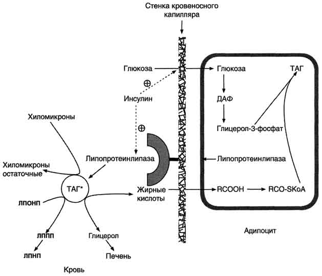 Действие липопротеинлипазы на ХМ. В крови триацилглицеролы, входящие в состав зрелых ХМ, гидролизуются ферментом липопротеин-липазой, или ЛП-липазой. ЛП-липаза связана с гепарансульфатом (гетерополисахаридом), находящимся на поверхности эндотелиальных клеток, выстилающих стенки капилляров кровеносных сосудов. ЛП-липаза гидролизует молекулы жиров до глицерола и 3 молекул жирных кислот. На поверхности ХМ различают 2 фактора, необходимых для активности ЛП-липазы - апоС-П и фосфолипиды. АпоС-П активирует этот фермент, а фосфолипиды участвуют в, связывании фермента с поверхностью ХМ. ЛП-липаза синтезируется в клетках многих тканей: жировой, мышечной, в лёгких, селезёнке, клетках лактирующей молочной железы. Изоферменты ЛП-липазы в разных тканях отличаются по значению Кm: ЛП-липаза жировой ткани имеет в 10 раз более высокое значение Кm, чем, например, ЛП-липаза сердца, поэтому гидролиз жиров ХМ в жировой ткани происходит в абсорбтивный период. Жирные кислоты поступают в адипоциты и используются для синтеза жиров. В постабсорбтивном состоянии, когда количество жиров в крови снижается, ЛП-липаза сердечной мышцы продолжает гидролизовать жиры в составе ЛПОНП, которые присутствуют в крови в небольшом количестве, и жирные кислоты используются этой тканью как источники энергии, даже при низкой концентрации жиров в крови. ЛП-липазы нет в печени, но на поверхности клеток этого органа имеется другой фермент - печёночная липаза, не действующая на зрелые ХМ, но гидролизующая жиры в ЛППП, которые образуются из ЛПОНП.В результате действия ЛП-липазы на жиры ХМ образуются жирные кислоты и глицерол. Основная масса жирных кислот проникает в ткани. В жировой ткани в абсорбтивный период жирные кислоты депонируются в виде триацилглицеролов, в сердечной мышце и работающих скелетных мышцах используются как источник энергии. Другой продукт гидролиза жиров, глицерол, растворим в крови, транспортируется в печень, где в абсорбтивный период может быть использован для синтеза жиров В результате действия ЛП-липазы на ХМ количество жиров в них снижается на 90%, уменьшаются размеры частиц, апопротеин С-П переносится обратно на ЛПВП. Образовавшиеся частицы называются остаточными ХМ. Они содержат в себе фосфолипиды, холестерол, жирорастворимые витамины и апопротеины В-48 и Е. Остаточные ХМ захватываются гепатоцитами, которые имеют рецепторы, взаимодействующие с этими апопротеинами. Путём эндоцитоза остаточные ХМ попадают внутрь клеток, и ферментами лизосом белки и липиды гидролизуются, а затем утилизируются. Жирорастворимые витамины и экзогенный холестерол используются в печени или транспортируются в другие ткани.