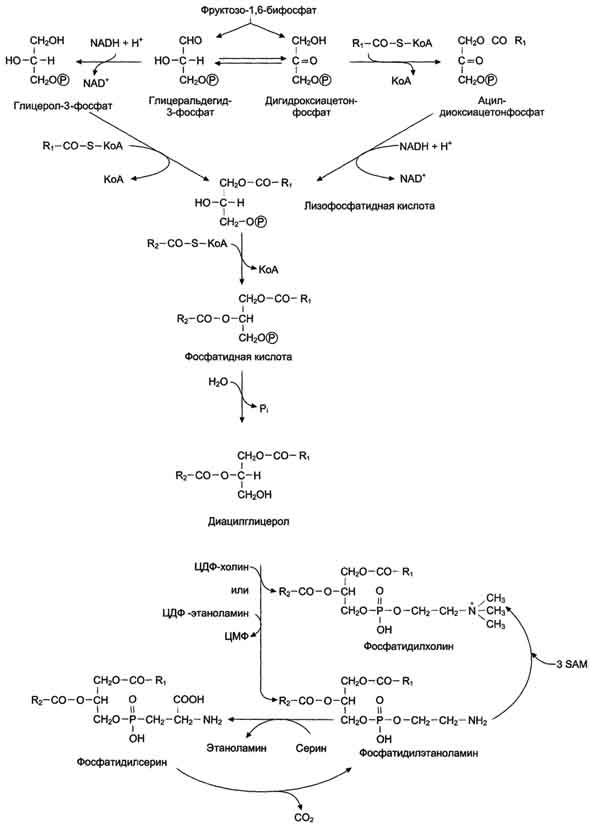 Синтез фосфатидилхолинов, фосфатидилэтаноламинов и фосфатидилсеринов. Начальные этапы синтеза глицерофосфолипидов и жиров происходят одинаково до образования фосфатидной кислоты. Фосфатидная кислота может синтезироваться двумя разными путями: через глицеральдегид-3-фосфат и через дигидроксиацетонфосфат