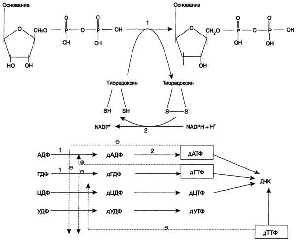 Рибонуклеотидредуктаза - олигомерный белок, состоящий из двух В1- и двух В2-субъединиц, и содержит негеминовое железо в качестве кофактора. Непосредственным донором водорода в реакции восстановления рибозы служит низкомолекулярный белок тиоредоксин. В рабочую часть этого белка входят 2 SH-группы, которые, отдавая водород, окисляются с образованием дисульфидного мостика. Второй фермент комплекса - тиоредоксинредуктаза - катализирует гидрирование окисленного тиоредоксина с использованием NADPH. При участии комплекса РНР образуются: dАДФ, dГДФ, dУДФ и dЦДФ, которые с помощью НДФ-киназ превращаются в дНТФ, 3 из которых (кроме дУДФ) непосредственно используются в синтезе ДНК.