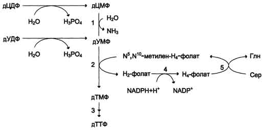Скорость синтеза дТМФ зависит также от количества второго субстрата тимидилатсинтазной реакции - N5,N10-метилен-Н4-фолата, пополнение запасов которого осуществляется при участии 2 ферментов: дигидрофолатредуктазы, которая с участием NADPH восстанавливает Н2-фолат в Н4-фолат, и серии гидроксиметилтрансферазы, осуществляющей перенос β-гидроксиметиленовой группы серина на Н4-фолат. У человека дТМФ образуется, главным образом, из дЦДФ.