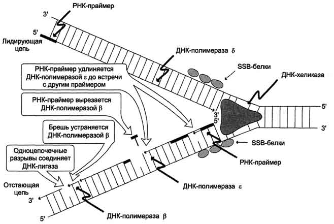 Олигонуклеотид, синтезированный ДНК-полимеразой α и образующий небольшой двухцепочечный фрагмент с матрицей, позволяет присоединиться ДНК-полимеразе δ и продолжить синтез новой цепи в направлении от 5'- к 3'-концу по ходу раскручивания репликативной вилки. ДНК-полимераза δ последовательно наращивает цепь, шаг за шагом присоединяя к ней соответствующие дезоксинуклеотиды. Выбор ДНК-полимеразой δ очередного нуклеотида определяется матрицей. Включение дезоксирибонуклеозидмонофосфатов в растущую цепь ДНК сопровождается гидролизом макроэргических связей соответствующих нуклеозидтрифосфатов и отщеплением пирофосфата (Н4Р2О7). Энергия макроэргических связей расходуется на образование 3',5'-фосфодиэфирной связи между последним нуклеотидом растущей цепи ДНК и присоединяемым нуклеотидом. Включение нуклеотида в синтезируемую цепь ДНК невозможно без предварительного связывания азотистого основания водородными связями с комплементарным нуклеотидом матричной цепи. ДНК-полимеразы (α, β, γ, δ, ε) могут синтезировать нуклеотидную цепь только в направлении 5'→3', матричная цепь всегда считывается в направлении 3'→5'. В каждой репликативной вилке идёт одновременно синтез двух новых (дочерних) цепей. Направление синтеза цепи ДНК совпадает с направлением движения репликативной вилки лишь для одной из вновь синтезируемых цепей (лидирующая цепь). На второй матричной цепи синтез дочерней ДНК осуществляется двумя ферментами: ДНК-полимеразой α и ДНК-полимеразой ε в направлении 5'→3', но против движения репликативной вилки. Поэтому вторая цепь синтезируется прерывисто, короткими фрагментами, которые называют "фрагменты Оказаки" (по имени открывшего их исследователя). Дочерняя цепь ДНК, синтез которой происходит фрагментами, называют отстающей цепью. Каждый фрагмент Оказаки, примерно 100 нуклеотидных остатков, содержит праймер. Праймеры удаляет ДНК-полимераза β, постепенно отщепляя с 3'-конца фрагмента по одному ри-бонуклеотиду. К ОН-группе на 3'-конце предыдущего фрагмента ДНК-полимераза β присоединяет дезоксирибонуклеотиды в количестве, равном вырезанному праймеру и таким образом заполняет брешь, возникающую при удалении рибонуклеотидов. Фермент ДНК-лигаза катализирует образование фосфодиэфирной связи между 3'-ОН-группой дезоксирибозы одного фрагмента цепи ДНК и 5'-фосфатом следующего фрагмента. Реакция протекает с затратой энергии АТФ. Таким образом, из множества фрагментов Оказаки образуется непрерывная цепь ДНК.