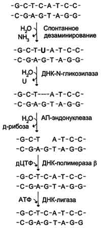 Депуринизация (апуринизация). ДНК каждой клетки человека теряет за сутки около 5000 пуриновых остатков вследствие разрыва N-гликозидной связи между пурином и дезоксирибозой. Тогда в молекуле ДНК на месте этих оснований образуется участок, лишённый азотистых оснований, названный АП-сайтом (AP-site, или апуриновый сайт). Термин "АП-сайт" используют также в тех случаях, когда из ДНК выпадают пиримидиновые основания и образуются апиримидиновые сайты (от англ, apurinic-apyrimidinic site). Этот тип повреждений устраняет фермент ДНК-инсертаза (от англ, insert - вставлять), который может присоединять к дезоксирибозе основание в соответствии с правилом компле-ментарности. В этом случае нет необходимости разрезать цепь ДНК, вырезать неправильный нуклеотид и репарировать разрыв.