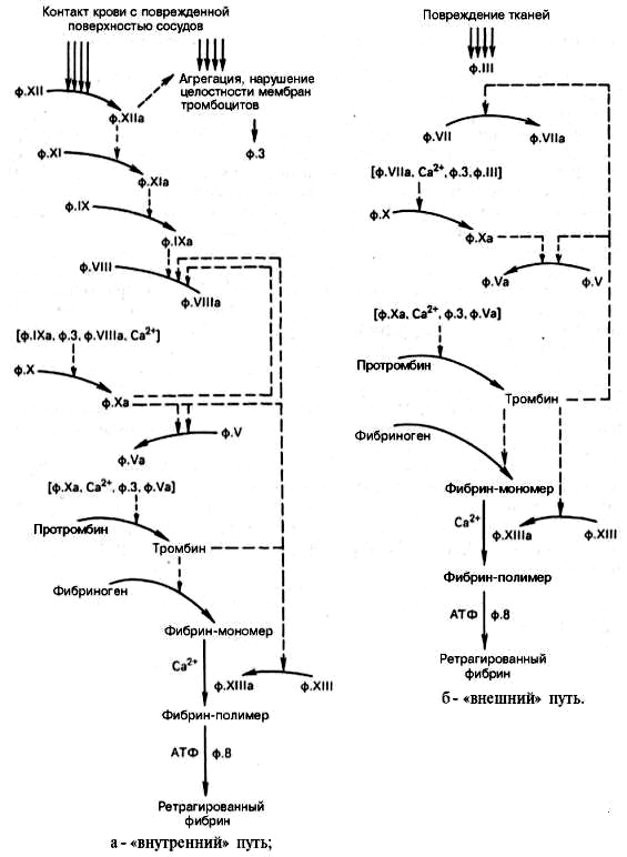 Для остановки кровотечения из капилляров и сосудов необходимо быстрое образование прочного тромба, препятствующего потере крови. Это достигается каскадом ферментативных реакций с механизмами усиления на многих этапах. Прокоагулянтный путь занимает центральное место в свёртывании крови. В циркулирующей крови содержатся проферменты протеолитических ферментов: фактор II (протромбин), фактор VII (проконвертин), фактор IX (Кристмаса), фактор X (Стюарта). Находящиеся в крови факторы Va (акцелерин) и VIIIa (антигемофильный фактор), а также мембранный белок - тканевый фактор (ТФ, фактор III) являются белками-активаторами этих ферментов. При повреждении сосуда "включается" каскадный механизм активации ферментов с последовательным образованием трёх связанных с фосфолипидами клеточной мембраны ферментных комплексов. Каждый комплекс состоит из протеолитического фермента, белка-активатора и ионов Са2+: VIIa-TO-Ca2+, IXa-VIIIa-Са2+ (теназа), Xa-Va-Са2+ (протромбиназа). Комплекс Xa-Va-Са2+ (протромбиназный комплекс) активирует протромбин (фактор II). Каскад ферментативных реакций завершается образованием мономеров фибрина и последующим формированием тромба. В активации ферментов каскада выделяют три основных механизма: частичный протеолиз, взаимодействие с белками-активаторами и взаимодействие с модифицированными клеточными мембранами.