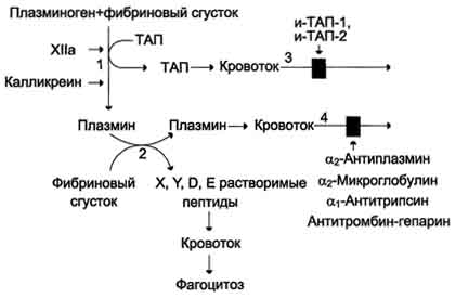 Растворение фибринового сгустка происходит при взаимодействии фибрина, плазминогена и ТАП Формирование сети фибриновых волокон при образовании тромба сопровождается сорбцией на ней плазминогена и его активаторов. В молекуле плазмина и плазминогена есть участки, комплементарные доменам фибрина, причём одна молекула плазмина может связывать несколько молекул фибрина. Молекулы ТАП тоже имеют центры связывания с фибрином. Образующийся из плазминогена под действием ТАП плазмин гидролизует фибрин с образованием пептидов X и Y, активирующих фибринолиз, и пептидов D и E, его тормозящих. Растворимые пептиды X, Y, D, E поступают в кровоток и там фагоцитируются. Разрушение тромба приводит к освобождению из него плазмина и ТАП. В кровяном русле последние быстро инактивируются специфическими ингибиторами и улавливаются печенью. ТАП ингибируется ингибиторами тканевого активатора плазмина первого (и-ТАП-1) и второго (и-ТАП-2) типов, а плазмин - α2-антиплазмином или другими ингибиторами сериновых протеаз. В почках синтезируется протеолитический активатор плазминогена урокиназа, которая, превращая плазминоген в плазмин, способствует освобождению почечных клубочков от фибриновых волокон. Из β-гемолитического стрептококка выделили белок стрептокиназу, образующий комплекс с плазминогеном, в котором плазминоген аутокаталитически превращается в плазмин. Урокиназу, стрептокиназу и ТАП используют при тромболитической терапии инфаркта миокарда, тромбозах вен и артерий, гемодиализе. Такие ингибиторы ферментов свёртывания крови, как α2-макроглобулин, α1-антитрипсин и комплекс антитромбин III-гепарин также обладают небольшой фибринолитической активностью. Снижение фибринолитической активности крови сопровождается тромбозами. Нарушение разрушения фибринового сгустка может быть вызвано наследственным дефицитом плазминогена или генетическим дефектом его структуры, снижением поступления в кровь активаторов плазминогена, повышением содержания в крови ингибиторов фибринолиза (и-ТАП-1, и-ТАП-2, α2-антиплазмина). Наследственные и приобретённые нарушения гемостаза могут привести как к геморрагическим заболеваниям, характеризующимся кровоточивостью, так и к тромботической болезни. Однако следует отметить, что повышенная склонность к тромбообразованию и внутрисосудистому свёртыванию (тромбофилии) встречается гораздо чаще, чем гемофилии. Например, частота разных форм гемофилии колеблется в разных странах от 6 до 18 на 100 000 мужчин, в то время как тромбофилии, вызванные дефицитом антитромбина III, встречаются у 1-2 больных на 5000, а при недостатке протеина С - у одного на 15 000 человек.