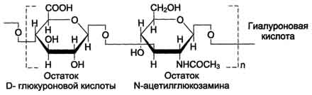 Гиалуроновая кислота находится во многих органах и тканях. В хряще она связана с белком и участвует в образовании протеогликановых агрегатов, в некоторых органах (стекловидное тело глаза, пупочный канатик, суставная жидкость) встречается и в свободном виде. Предполагается, что в суставной жидкости гиалуроновая кислота выполняет роль смазочного вещества, уменьшая трение между суставными поверхностями. Повторяющаяся дисахаридная единица в гиалуроновой кислоте имеет следующую структуру: