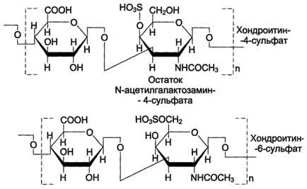 Хондроитинсульфаты - самые распространённые гликозаминогликаны в организме человека; они содержатся в хряще, коже, сухожилиях, связках, артериях, роговице глаза. Хондроитинсульфаты являются важным составным компонентом агрекана - основного протеогликана хрящевого матрикса. В организме человека встречаются 2 вида хондроитинсульфатов: хондроитин-4-сульфат и хондроитин-6-сульфат. Они построены одинаковым образом, отличие касается только положения сульфатной группы в молекуле N-ацетилгалактозамина.