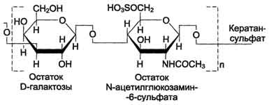 Кератансульфаты - наиболее гетерогенные гликозаминогликаны; отличаются друг от друга по суммарному содержанию углеводов и распределению в разных тканях. Кератансульфат I находится в роговице глаза и содержит кроме повторяющейся дисахаридной единицы L-фукозу, D-маннозу и сиаловую кислоту. Кератансульфат II был обнаружен в хрящевой ткани, костях, межпозвоночных дисках. В его состав помимо Сахаров дисахаридной единицы входят N-ацетилгалактозамин, L-фукоза, D-манноза и сиаловая кислота. Кератансульфат II входит в состав агрекана и некоторых малых протеогликанов хрящевого матрикса. В отличие от других гликозаминогликанов, кератансульфаты вместо гексуроновой кислоты содержат остаток галактозы.