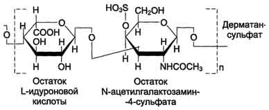 Дерматансульфат широко распространён в тканях животных, особенно он характерен для кожи, кровеносных сосудов, сердечных клапанов. В составе малых протеогликанов (бигликана и декорина) дерматансульфат содержится в межклеточном веществе хрящей, межпозвоночных дисков, менисков. Повторяющаяся дисахаридная единица дерматансульфата имеет следующую структуру.