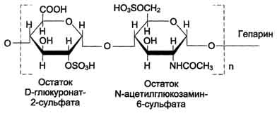 Гепарин - важный компонент противосвёртывающей системы крови (его применяют как антикоагулянт при лечении тромбозов). Он синтезируется тучными клетками и находится в гранулах внутри этих клеток. Наибольшие количества гепарина обнаруживаются в лёгких, печени и коже. Дисахаридная единица гепарина похожа на дисахаридную единицу гепарансульфата. Отличие этих гликозаминогликанов заключается в том, что в гепарине больше N-сульфатных групп, а в гепарансульфате больше N-ацетильных групп. Молекулярная масса гепарина колеблется от 6 × 103 до 25 × 103 Д