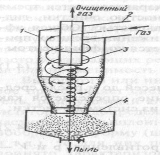 Циклон: 1 – внутренний цилиндр; 2 – патрубок; 3 – конус; 4 – бункер.