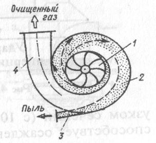 Ротационный пылеуловитель: 1 – вентиляционное колесо, 2 – кожух, 3 – пылеприёмник, 4 – патрубок.