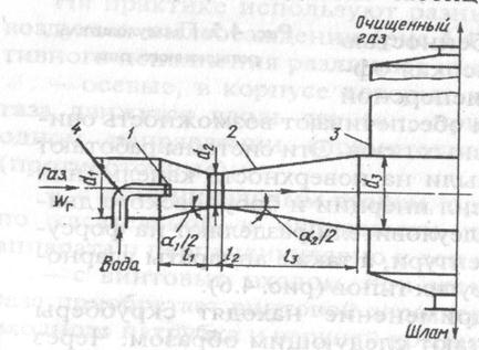Наибольшее практическое применение находят скрубберы Вентури, которые работают следующим образом. Через патрубок 4, газ попадает в устройство 2, которое называется соплом Вентури. Сопло Вентури имеет конфузор (сужение), в который через форсунки 1 подается вода на орошение. В этой части сопла скорость газа увеличивается, достигая максимума в самом узком сечении (с 10¸20 до 100¸150 м/с). Увеличение скорости способствует осаждению частиц пыли на каплях воды.