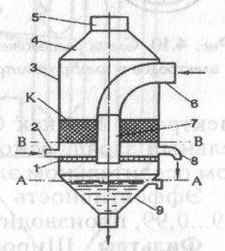 Запыленный воздух поступает через воздуховод 6 в вертикальный стояк 7. Перед поворотом на 180° воздух ударяется о поверхность воды А-А, вследствие чего сепарируются крупные частицы пыли. Далее воздух проходит через решетку 1 с отверстиями. На нее через трубу 2 подается вода, излишки которой сливаются через трубу 8 и частично через отверстия решетки 1. Между решеткой и уровнем В-В образуется водяная пена, которая затем распространяется в объёме К, заполненном короткими фарфоровыми цилиндрами. Мелкие частицы пыли последовательно улавливаются в пене, а затем в объёме К.