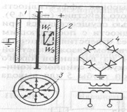 Их работа основана на одном из наиболее эффективных видов очистки газовой пыли – электрическом. Электрофильтры также используют и для очистки тумана. Основной принцип работы – ударная ионизация газа в неоднородном электрическом поле, которое создается в зазоре между коронирующим 1 и осадительным 2 электродами. Напряжение к электродам подается от выпрямителя 4. Силовые линии 3 направлены от осадительного к коронирующему. Загрязненные газы, попав между электродами, способны проводить ток вследствие имеющейся частичной ионизации. При увеличении напряжения электрического тока число ионов растет, пока не наступит предельное насыщение, и все ионы не окажутся вовлеченными в движение от одного электрода к другому. Отрицательно заряженные частицы движутся к осадительному электроду, а положительно заряженные оседают на коронирующем электроде. Так как большинство частиц пыли получают отрицательный заряд, основная масса пыли осаждается на положительном осадительном электроде, с которого пыль легко удаляется.