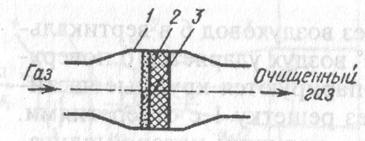 В корпусе 1 фильтра расположена воздухопроницаемая перегородка 2, на которой осаждаются улавливаемые частицы 3.