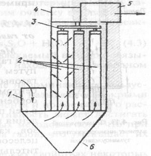 Схема рукавного фильтра: 1 – выходной патрубок; 2 – рукав; 3 – подвеса рукавов; 4 – встряхивающий механизм; 5 – выходной патрубок; 6 – бункер.