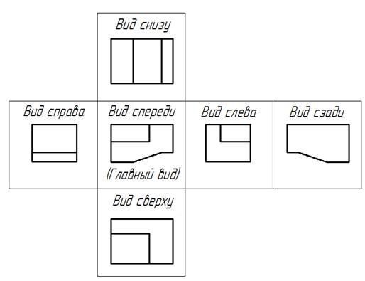 Изображения предметов выполняются по методу прямоугольного (ортогонального) проецирования. При этом предмет располагается между наблюдателем и соответствующей плоскостью проекций. За основные плоскости проекций принимают шесть граней куба, совмещенные с плоскостью в соответствии с рисунком 6.