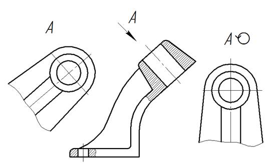 Если какая-либо часть предмета не может быть показана на основных плоскостях проекций без искажения формы, применяют дополнительные виды, которые получают на плоскостях, непараллельных основным плоскостям проекций (рис. 9). Дополнительные виды обозначаются аналогично видам на основных плоскостях проекций (рис. 9). Дополнительный вид, расположенный в непосредственной проекционной связи с соответствующим изображением, не обозначается, и направление проецирования не указывается. Допускается поворот дополнительного вида до положения, принятого для предмета на главном изображении. При этом обозначение вида должно быть дополнено условным графическим обозначением ã - знаком «повернуто» (рис. 9). При необходимости указывают значение угла поворота.