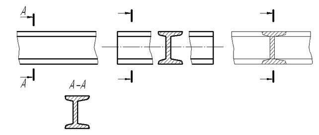 Для несимметричных сечений, расположенных в разрыве или наложенных (рис. 15), линию сечения проводят и наносят стрелки, но буквы не ставят. Во всех остальных случаях обозначение линии сечения и самого сечения выполняют также как и для разреза. Секущие плоскости выбирают так, чтобы получить нормальные поперечные сечения.