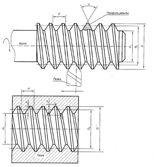 Резьба представляет собой поверхность, образованная при винтовом движении плоского контура по цилиндрической и конической поверхности.