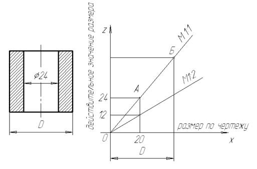 Для определения действительного размера элемента детали замеренный с помощью циркуля размер, например диаметр втулки D, откладывают по оси x от точки О. Из конца отрезка по вертикали проводят линию до пересечения с прямолинейным лучом в точке Б. Перпендикуляр из этой точки к оси z определит действительную величину размера D. Если есть необходимость построить линию пропорционального масштаба, например М 1:2, то для данного случая на оси z откладывают размер 12мм, а на оси x20мм.