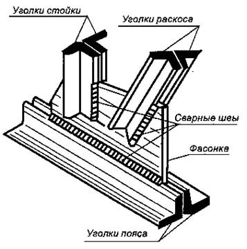 Размеры и форма фасонки зависят от действующих в узле усилий, расположения элементов решетки по отношению к узлу, длины швов приварки к фасонке отдельных элементов решетки фермы, сходящихся в узле.