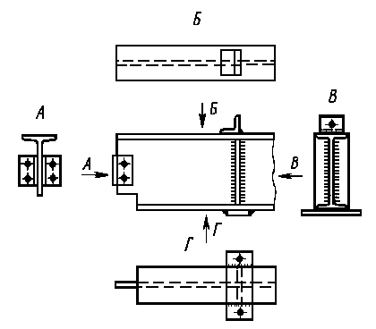 Виды на чертежах металлических конструкций принято располагать следующим образом: вид сверху в проекционной связи – над главным видом, вид снизу – под главным видом, вид справа – справа от главного вида, вид слева – слева от главного вида. Над каждым видом (кроме главного) делают надпись по типу «А», а направление взгляда указывают стрелкой, обозначенной соответствующей буквой. Такое расположение отдельных изображений (видов) получается при проецировании по методу третьего угла (метод А) (рис. 61).