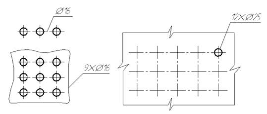 Диаметры отверстий, заклепок и болтов указывают на полке линии-выноски. Если отверстия, заклепки или болты расположены на одной оси, то размер их указывается от оси. В случае, когда размеры расположены группой, их обводят тонкой волнистой линией и выносную надпись указывают от этой линии. Когда же одинаковые отверстия располагаются на осях, то размеры их и число указывают в соответствии с рисунком 64.