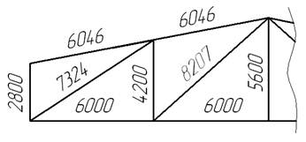 Геометрической схемой фермы называется ее изображение, где элементы решетки вычерчены условно в одну линию. Геометрическая схема определяет форму и основные размеры фермы – пролет, высоту и расстояния по центрам между отдельными ее узлами (рис. 65). Эти расстояния, указываемые в миллиметрах, проставляются непосредственно над элементами решетки без выносных и размерных линий. В проектной практике на геометрической схеме отмечаются также усилия в том или ином стержне, которые проставляются под изображением стержня. В случае наличии в левой части указываются только размеры между узлами, а в правой – только усилия. Для симметричной конструкции рекомендуется вычерчивать схему половины конструкции.