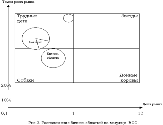 Модель BCG представляет из себя матрицу, на которой бизнес-единицы изображены окружностями (рис. 2). Ось абсцисс является логарифмической, поэтому коэффициент, характеризующий относительную долю рынка, занимаемую бизнес-областью, изменяется от 0,1 до 10. Доля рынка рассчитывается как отношение объема продаж организации в соответствующей бизнес-области к общему объему продаж у ее конкурента. По оси ординат берутся темпы роста рынка, определяемые объемами выпущенной продукции. В оригинальной версии BCG границей высоких и низких темпов роста является 10%-ое увеличение объема производства в год.