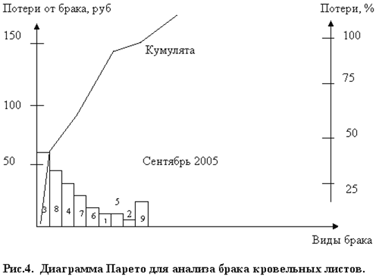 2. Виды брака располагают на графике в порядке убывания суммы потерь (рис.4). По оси абсцисс откладывают виды брака, по оси ординат – суммы потерь.