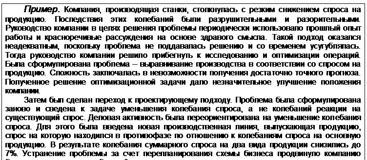 Проектирующий подход – это устранение проблемы путем изменения сути тех реальных обстоятельств и объектов, которые инициировали проблему. Цель проектирующего подхода состоит в изменении системы, где развивается проблема, либо внешнего окружения этой системы, с тем чтобы приблизить систему к желаемому состоянию. Желаемое состояние – это скорее развитие, чем расширение или сохранение. Развитие означает увеличение способности и потребности повышать как собственный уровень жизни, так и уровень жизни партнера.