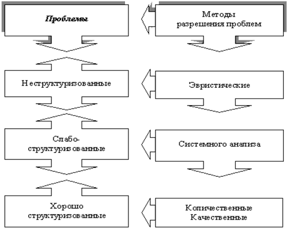 Для первого класса проблем научные методы не нужны, поскольку для их решения существует развитый и мощный аппарат математического моделирования и строгие количественные методы решения. Основная область приложения научных методов или методов системного анализа – второй класс проблем – слабоструктуризованные (рис. 4).