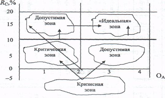 Сложилось несколько подходов к оценке финансовой состоятельности организации. С позиции параметрических исследований важной считается N-мерная параметрическая оценка эффективности управления. Наиболее известна двумерная оценка эффективности управления (матрица Дюпона), в которой по двум параметрам устанавливаются определенные зоны деятельности. Например, по значениям рентабельности продаж (Rc) и оборачиваемости активов (0А) выделяются зоны допустимой или кризисной деятельности (рис. 31). «Ответственной» информацией на этом графике являются значения параметров, разделяющие корреляционное поле, образуемое точками пересечения координат осей ОА и Rc на зоны, характеризующие финансовую состоятельность предприятия.